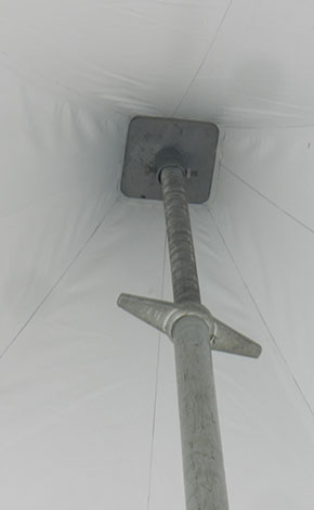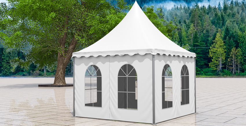 尖頂篷房系列尺寸有3×3米、4×4米,邊高是2.5米,采用二槽的48×84×2.5㎜鋁合金管材做支架。5×5米、6×6和10×10米的尖頂篷房標準邊高是2.5米,用四槽的48×105×3.5㎜鋁合金型材做支架,抗風速80公里/小時。